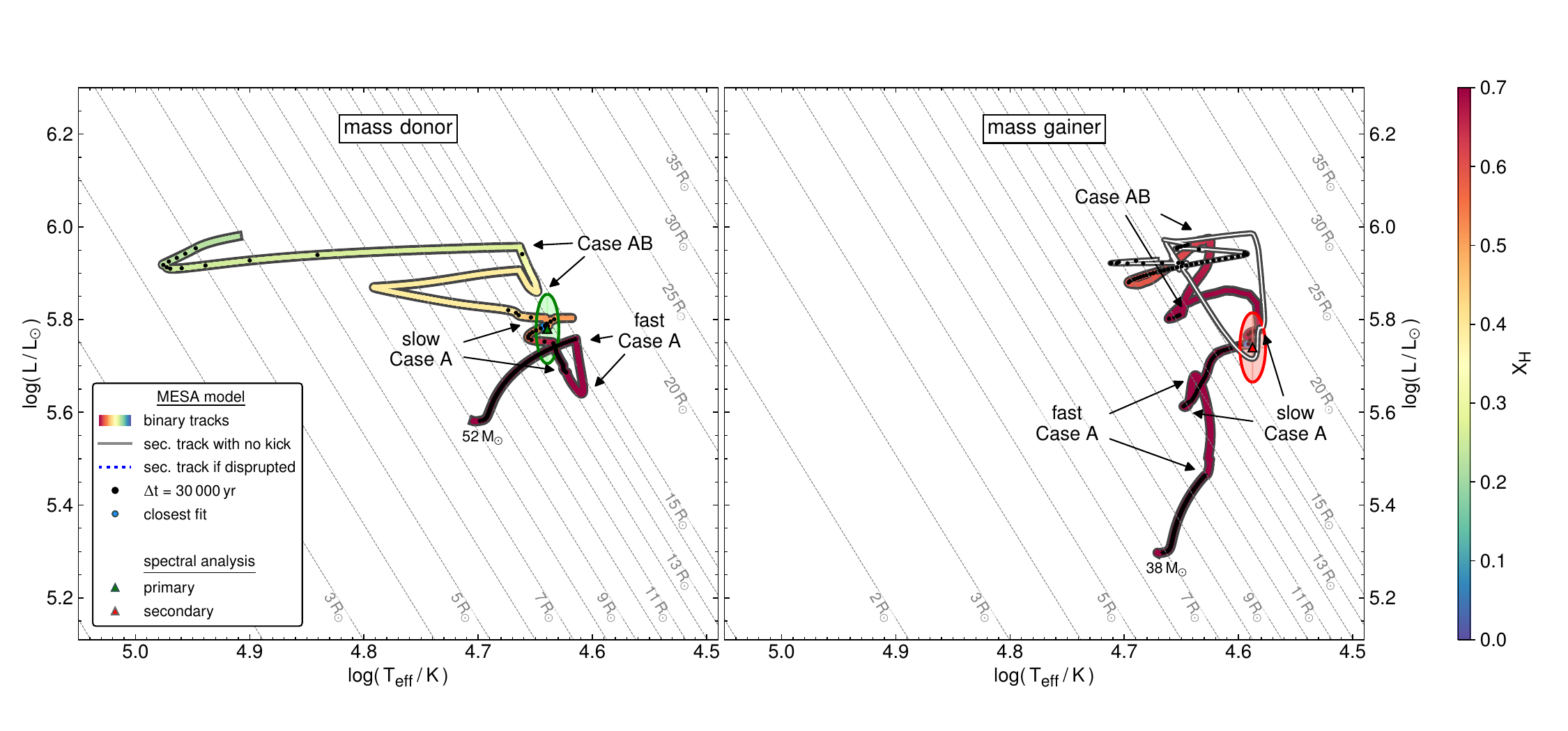 However, massive stars are rarely born alone and most of them can be found in binary or even higher multiplicity systems. All stars expand during their evolution and in a close binary system at some point the expanding material will feel the gravitiational attraction from the second star. When this happens, it is energetically easier for the material to be transfered to the secondary than being bound to the expanding star. This will start a phase of mass transfer during which the hydrogen rich envelope of the expanding star will be removed. After a phase of stable mass transfer the binary will consist of a partially stripped star with a core hydorgen burning companion. However, the phase of mass transfer is short, compared to the lifetime of a star and observational counterparts are hard to detect. Hence, there are still many unknowns in the physics of mass transfer and the accretion efficiency of the secondary companion.