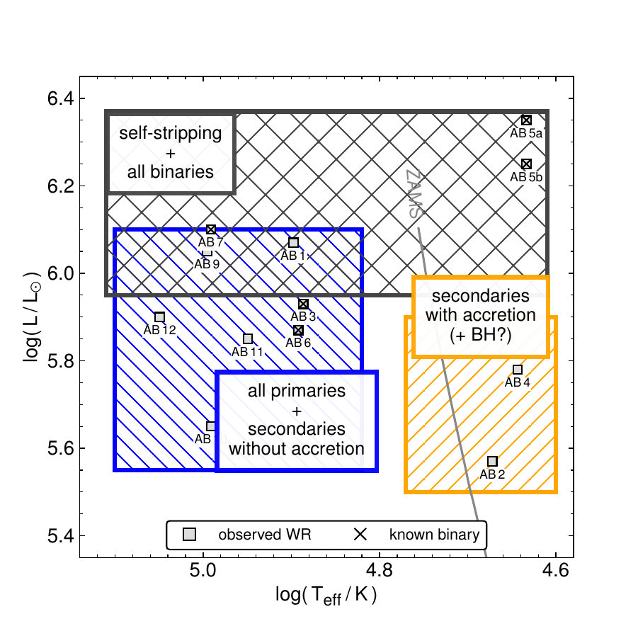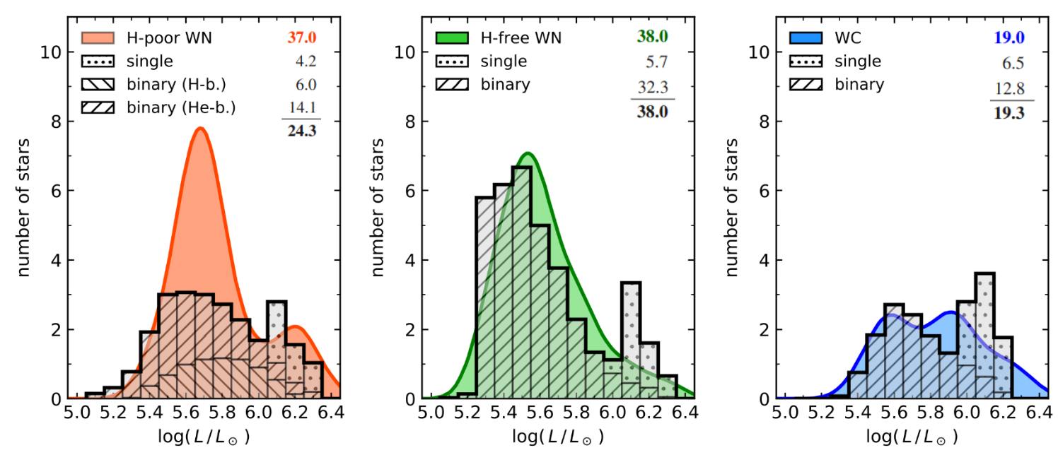 More than 50% of all massive stars are borne in binaries and will interact with each other during their life. However, it is not fully clear how these binary interactions influence our picture of stellar evolution. Are there dominant formation channels for specific kinds of stars that we observe? As already described above, Wolf-Rayet stars are stars that have lost most of their hydrogen rich envelope, either by removal of a stellar wind or by removal during an interaction with a companion star. Wolf-Rayet stars come in different flavours and can be subdivided in four classes: WN type stars with hydrogen that show strong emission lines from nitrogen, helium and hydrogen; WN type stars without hydrogen, showing strong emission lines from nitrogen and helium; WC type stars, showing strong emission lines of carbon and helium (and maybe oxygen); And WO type stars showing strong emission lines of oxygen, carbon and helium. The total numbers of these subclasses in a complete statistical representative population of stars strongly depends on the assumed physics parameters, such as the mass-loss rates as well as the mass transfer efficiency.
