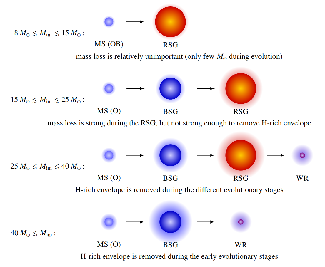 Massive stars strongly influence their surroundings during their entire evolution. When a massive star is still core hydrogen burning it is very hot and emits copious amounts of UV radiation. However, not all of this radiation can escape, as some fraction is absorped by heavier elemets — such as iron — in the stars atmosphere and is converted to kinetic energy in form of a stellar wind. These stellar winds can become very powerful and are thought to remove noticable amounts of material from the stellar surface, enriching its surrounding material. When the hydrogen is exhausted in the core of a star, it will start burning helium in its core while having a hydrogen rich envelope. In the case the star has still a large hydrogen rich envelope it will expand to several thousand times the radius of our Sun and because of that, the surface of the star will appear cooler (about 3500 K). On the night sky the extended star would appear red to the human eye. These stars are called "red supergiants" (RSG). However, if the star can lose its hydrogen rich envelope, for example it is blown away by a stellar wind, the processed material of the previously hydrogen burning core will be exposed at the surface and the star will appear even hotter (about 100,000 K). As a consequence it will have more UV radiation which can be used to power an even stronger wind. These partially or even fully stripped stars are typically classified as so-called "Wolf-Rayet" (WR) stars.